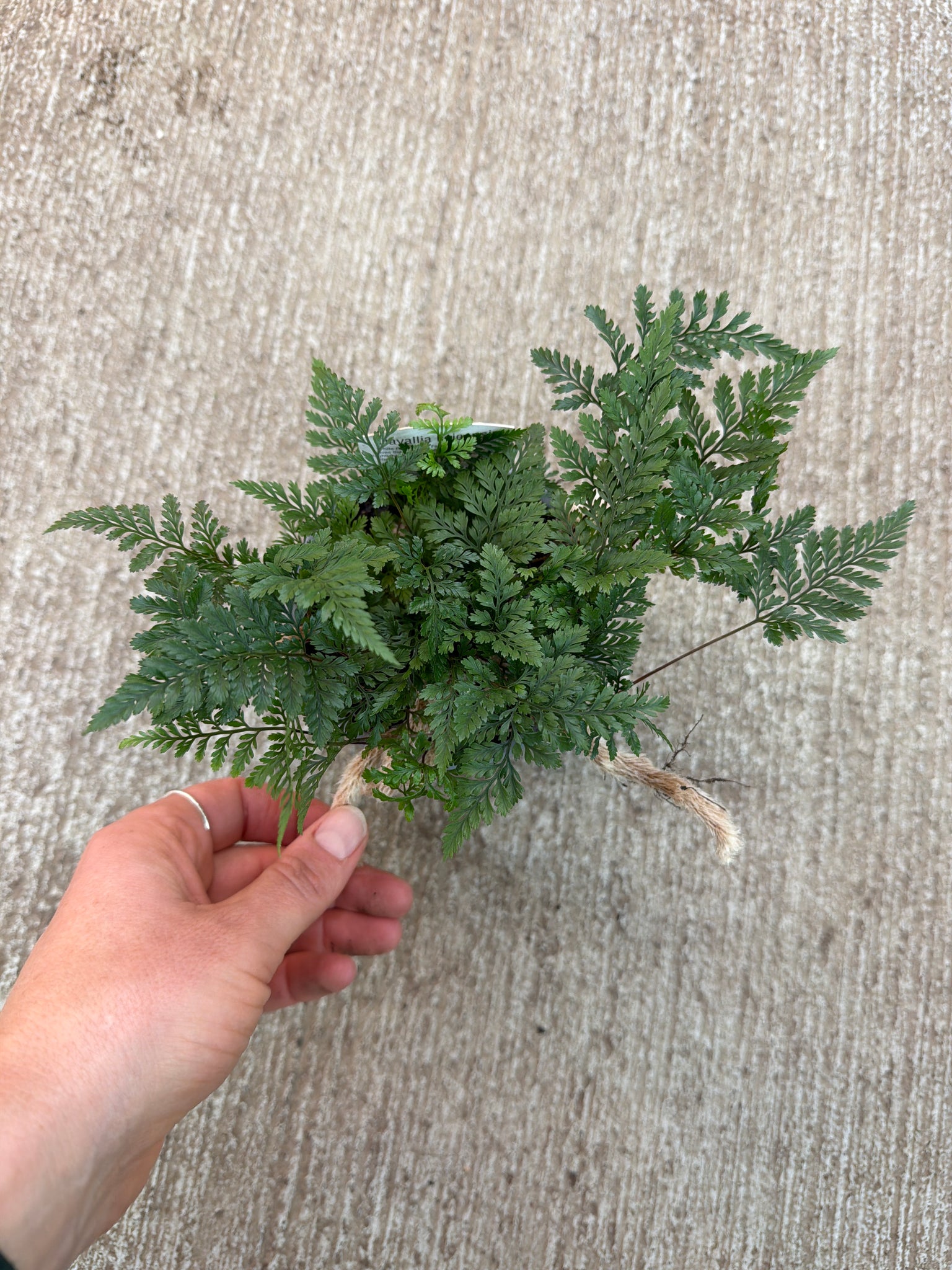 This Davallia fejeensis 4" - Rabbit Foot Fern features unique and fuzzy roots that beautifully creep out of the pot. These delicate roots not only add visual interest, but also help the fern absorb water and nutrients for optimal growth. An excellent choice for any plant lover or avid gardener.